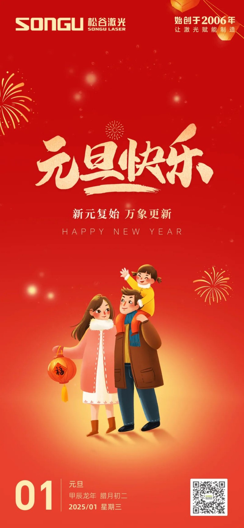 隨著歲月的腳步悄然邁進(jìn),我們滿懷激動(dòng)與憧憬,共同迎來(lái)了充滿希望的2025年元旦。在這個(gè)辭舊迎新的美好時(shí)刻,松谷激光科技向全體員工、合作伙伴以及一直以來(lái)給予我們支持與信任的朋友們致以最誠(chéng)摯的祝福和最深切的感謝!