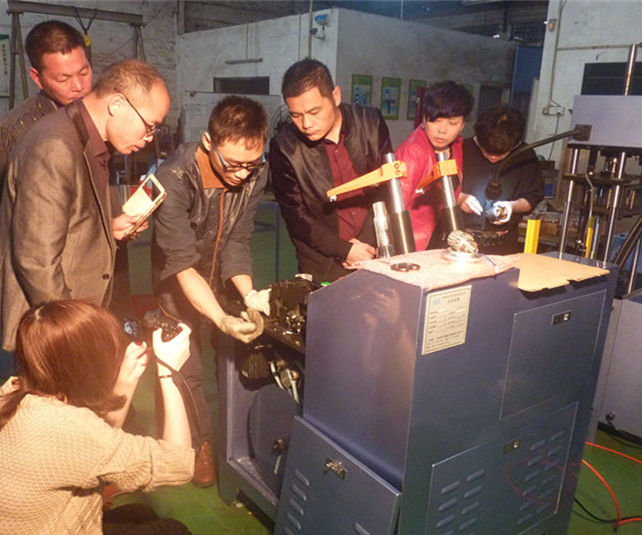 2015年3月2日,浙江溫州客戶來到華源公司開始學習嵌線機設備,年前客戶向本公司購買了一組嵌線設備,包括絕緣紙槽紙機,定子組合嵌線機,預整形機,單面綁線機,最終整形機。今天是溫州客戶培訓的第三天,在客戶熟悉設備的操作并試產了一批定子后,華源公司的技術人員開始就設備的拆裝維護與保養開始進行講解,圖為技術人員正在為客戶詳細地講解定子組合嵌線機中的打槽片機械結構部分如何拆裝維護及保養。