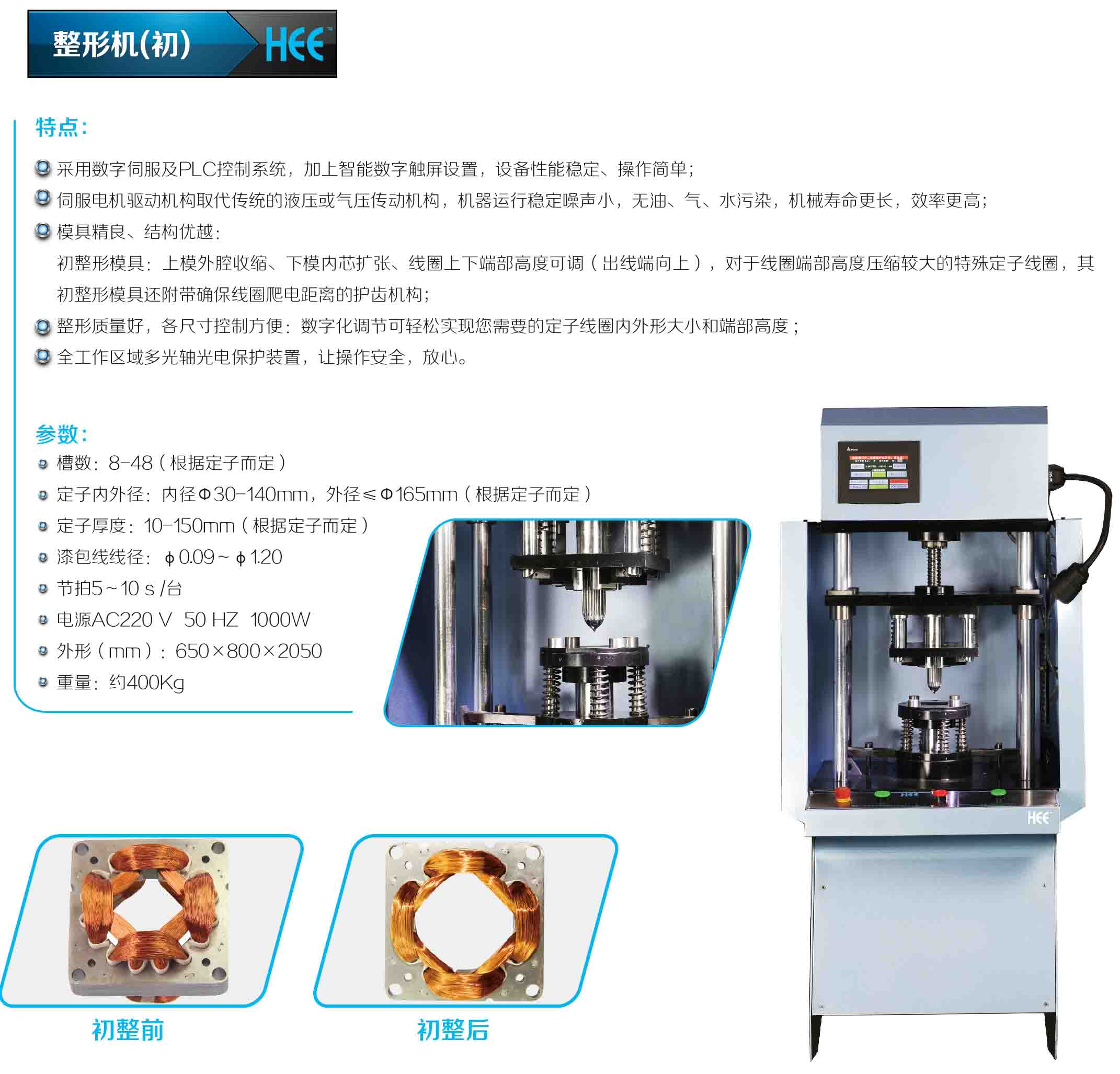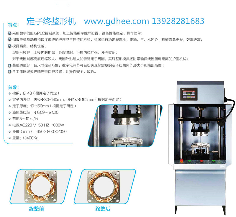 華源電機設備有限公司最新發行的定子初整型機內張型,與傳統的直筒初整型機的不同在于定子不單有調整嵌線后上下線組長度,更通過內張的設計原理達到整型闊張的整型效果,為后續工序更加簡便和整型效果更好。該機采用數字伺服及PLC控制系統智能控制,可對0.10-----1.20mm嵌好的漆包線定子經過整型之后,輕易安裝挑型和綁線。操作簡單,性能穩定,效率高;其特點在于: